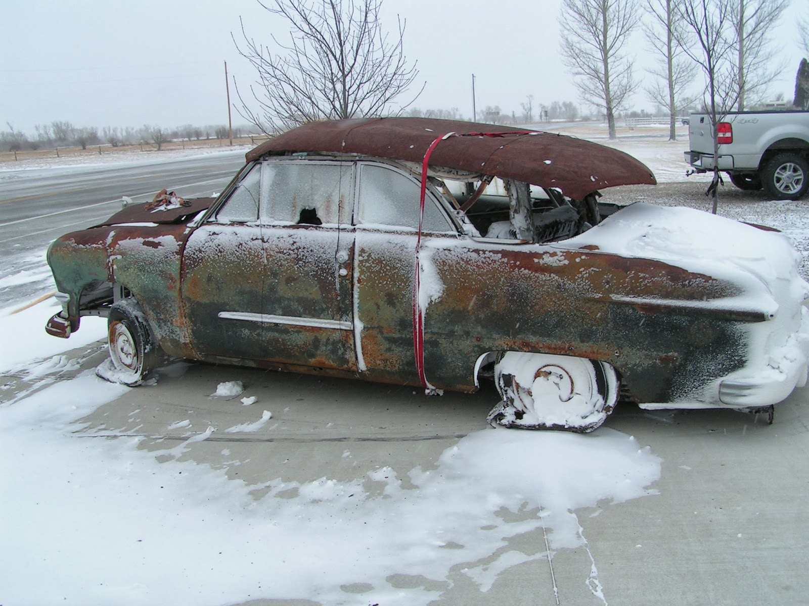 Well, I had a delivery yesterday in the middle of a blizzard. This is a 1949 ford deluxe convertible. I had to drag this car off the transport yesterday as none of the wheels will roll. This car came from abandoned Texas wrecking yard that closed up in the 70s. It has been sitting for a long time but is surprisingly straight and has very minimal rust. All the important convertible parts are present and accounted for. This is going to be a really fun project. I will start on it next year after guide season finishes.